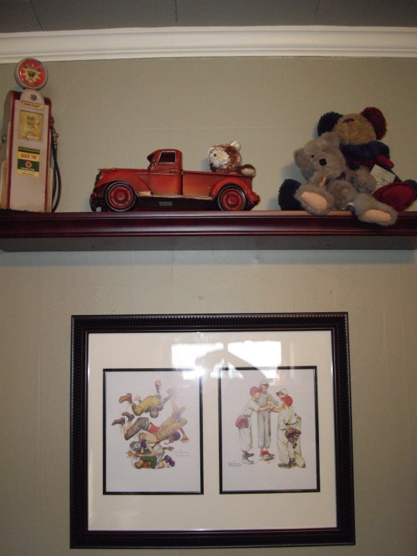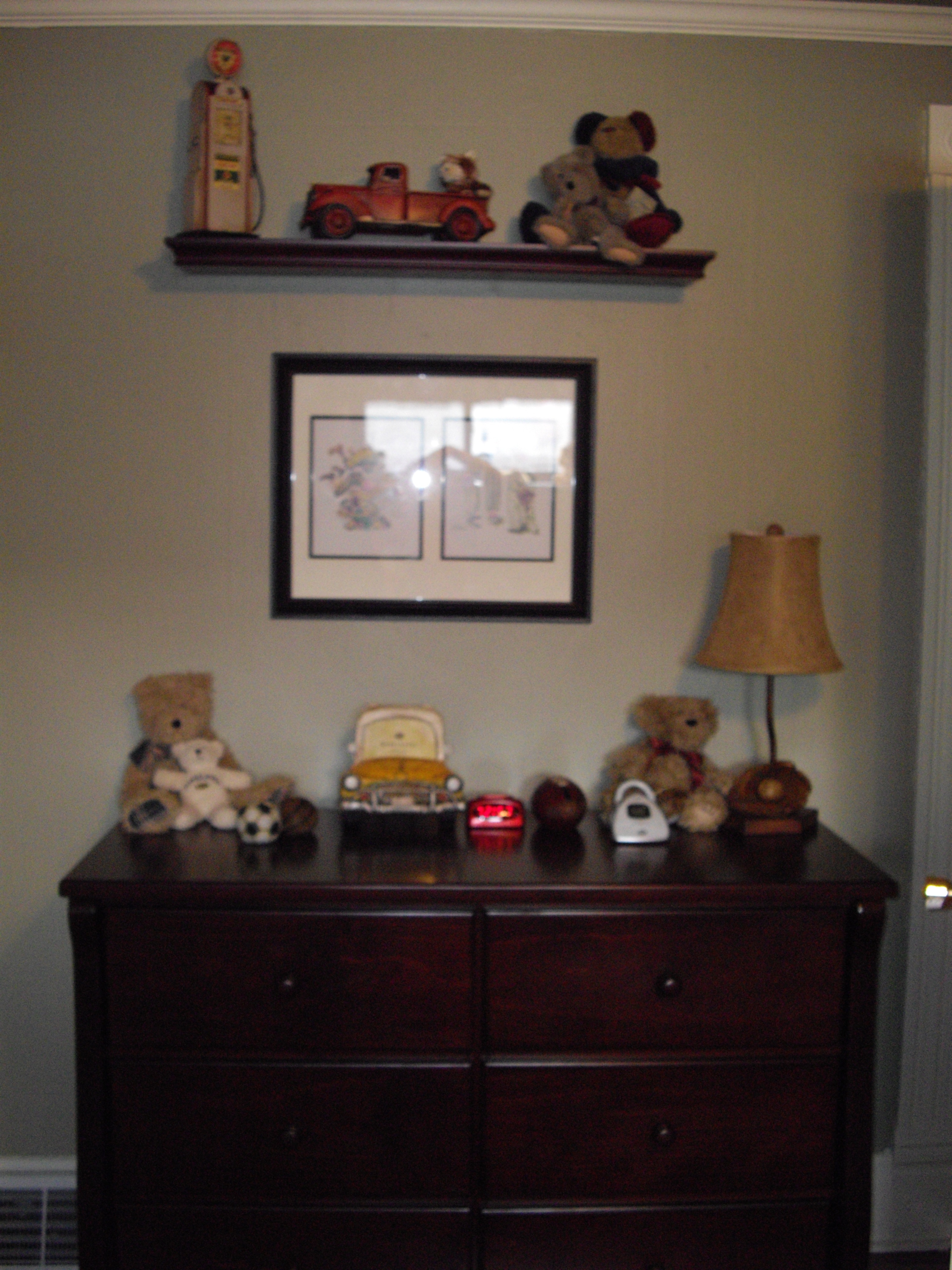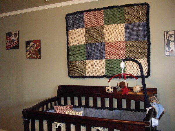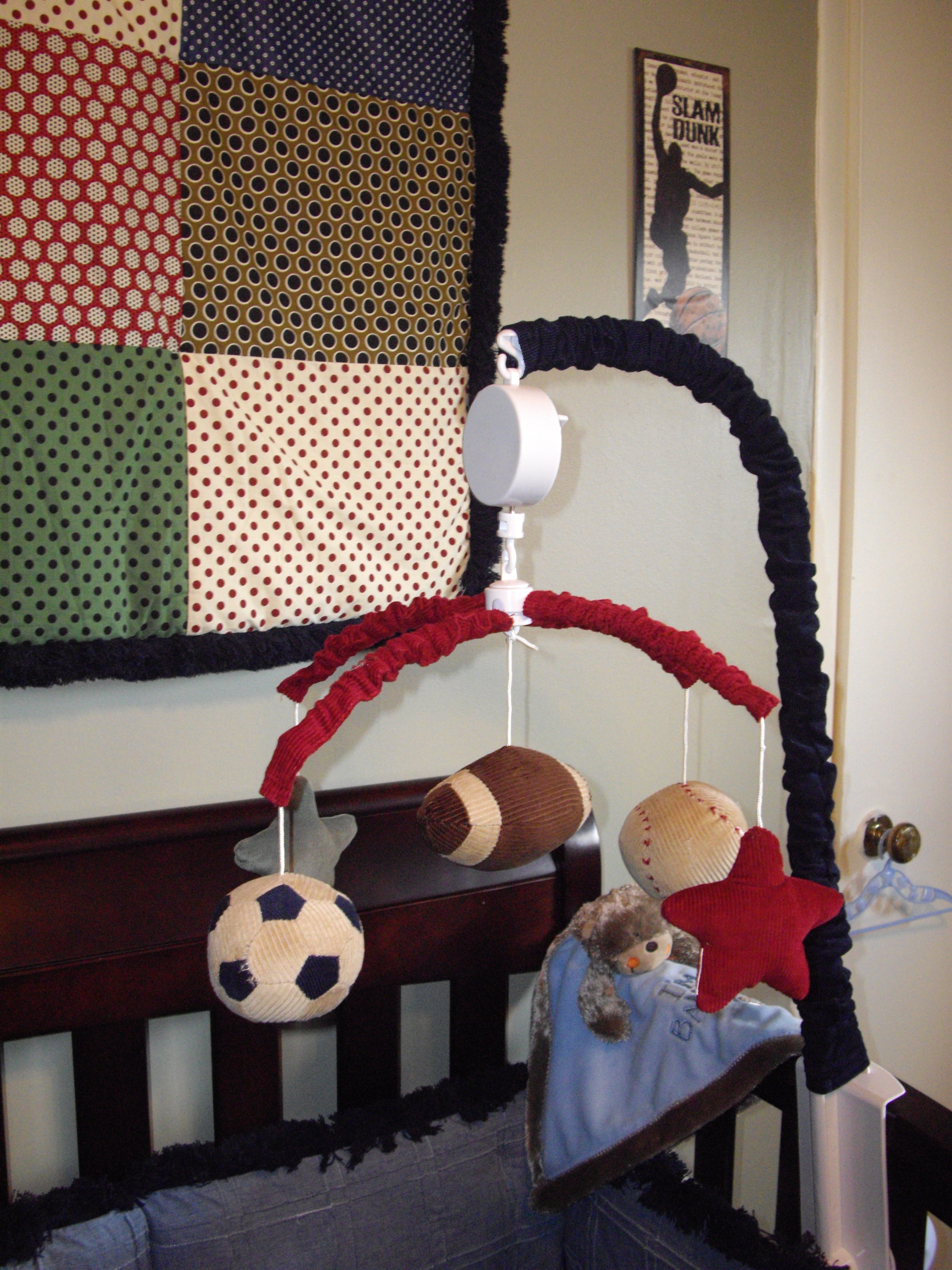 Just because it’s so cute, I thought I’d give you a look at my nephew, Dominic’s, nursery even though it’s not even in my house! My mom decorated the nursery. Most of the décor is from the Hobby Lobby, I just kept piling stuff in my cart (don’t you love spending other people’s money?!). The theme is antique toys. Mostly you’ll see sports and mobile related things. These photos were taken before the room was entirely complete so there are probably a few details missing. I think it’s adorable.