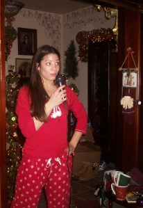 Here are our jammies for 2005! The store didn’t have enough matching pants so my sister and cousin had matching snowflake fleece pants and I had red, green, and white striped fleece pants. The shirts were red knit with pom poms.