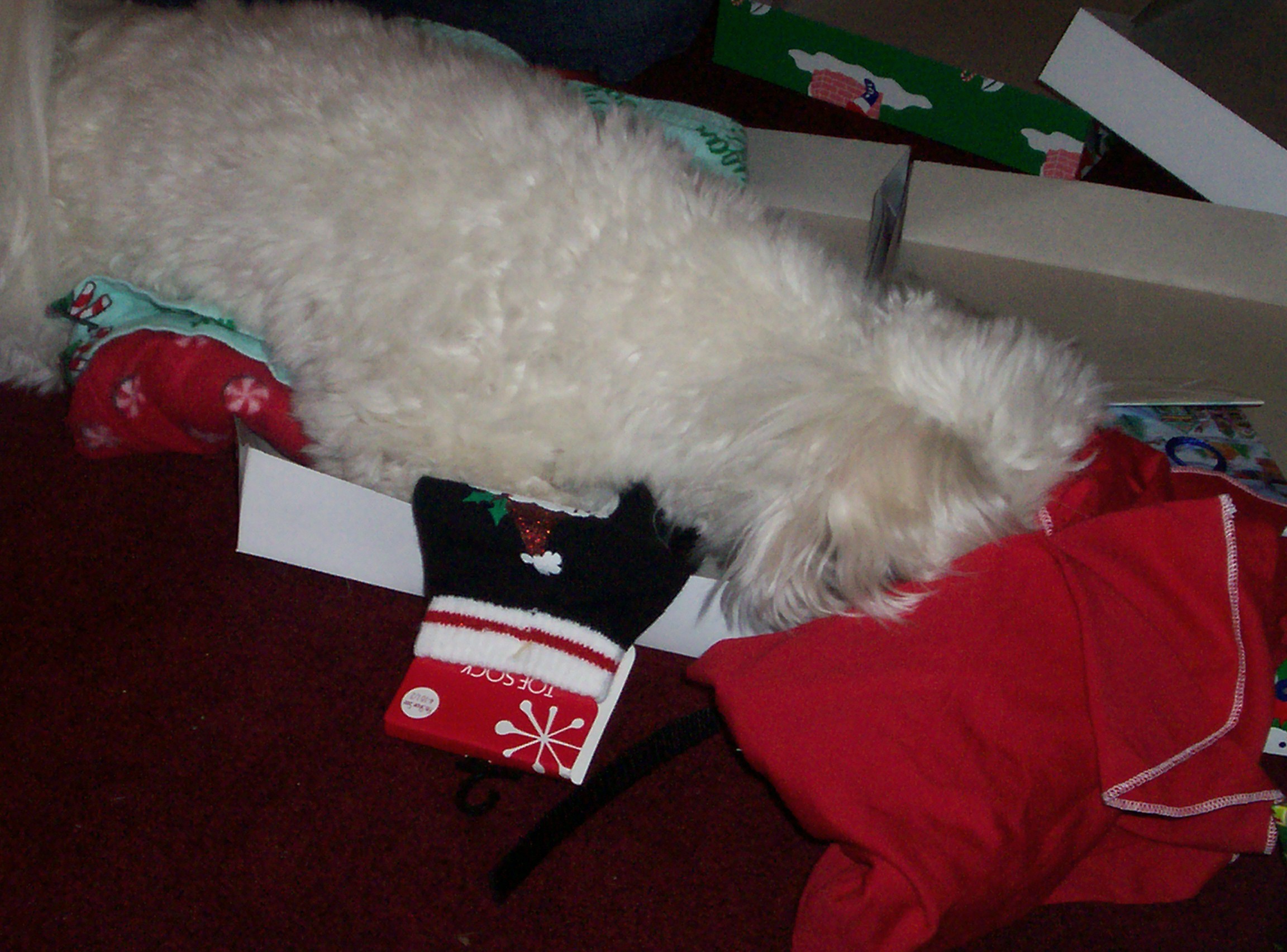 I don’t remember exactly what was going on with Muppet, but he was sad or ashamed or something and climbed into the gift boxes of Christmas pjs before we’d put them on. Poor fella.