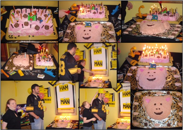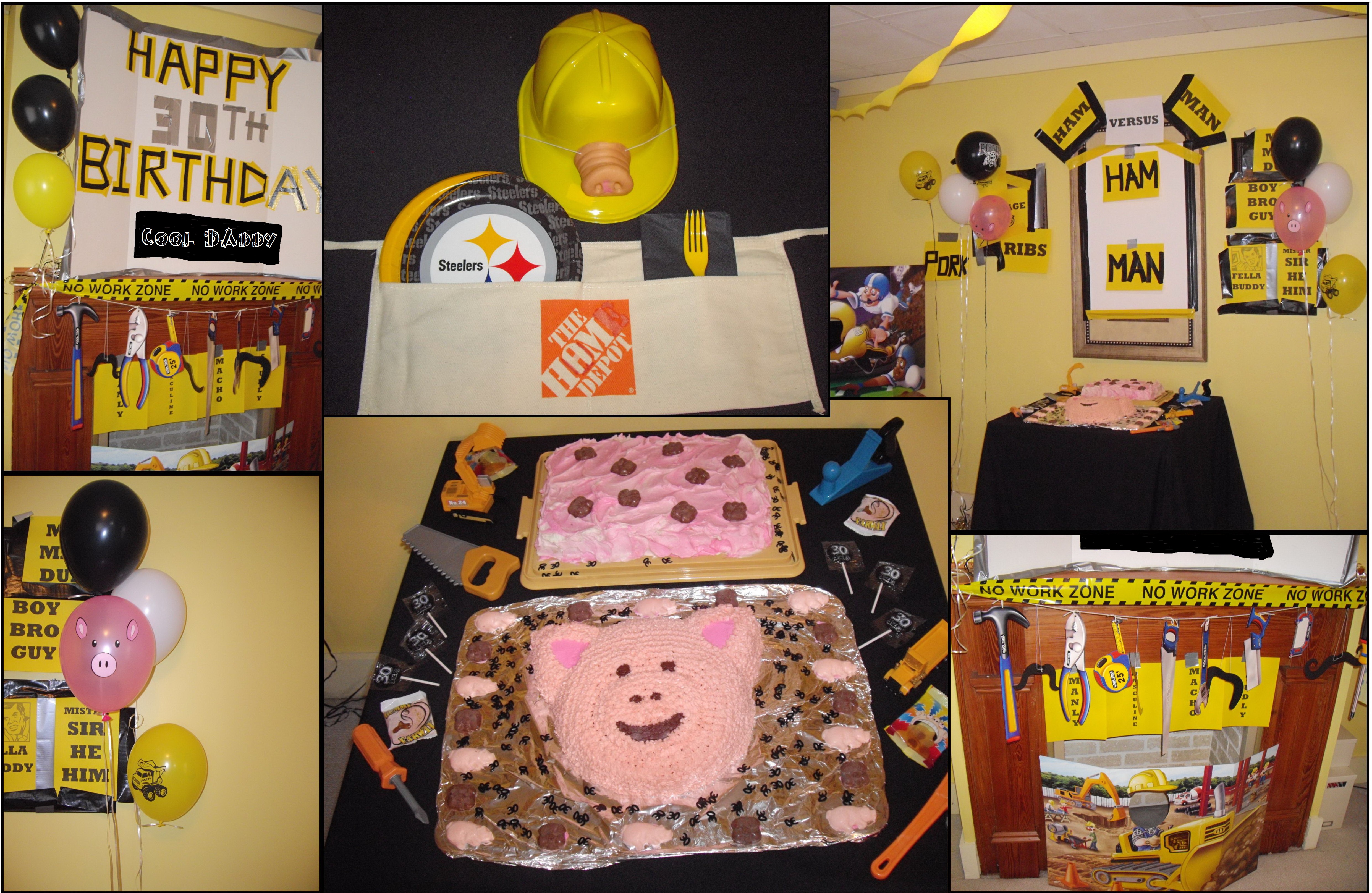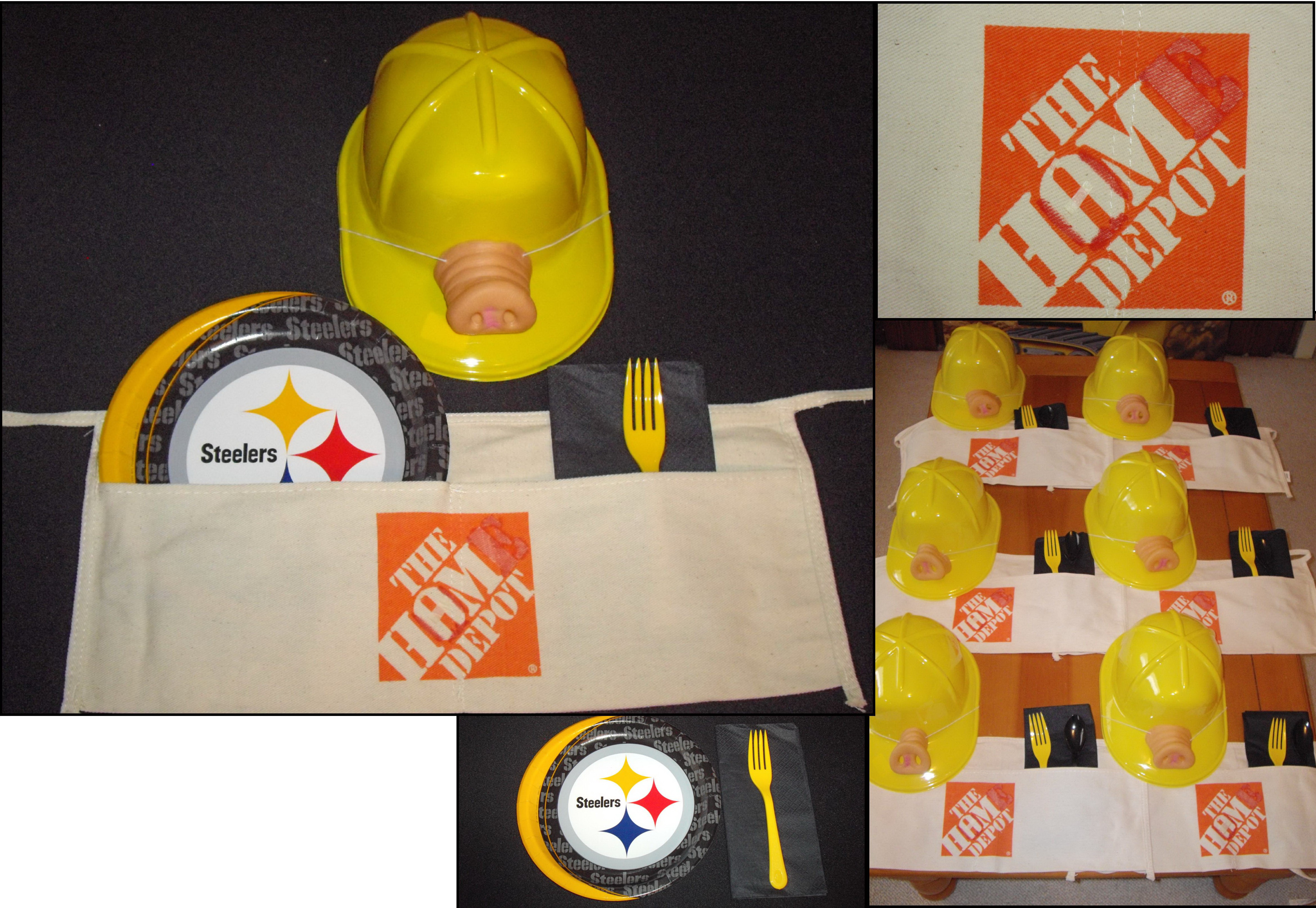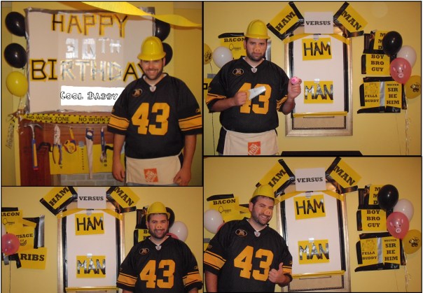 I was very tempted to do the whole party in pink. The irony of the Ham and Man pairing is that pigs are pink and I thought about going with a whole pink pig thing and only playing up on the “ham” side and sort of poking fun at the “man” side since it would actually all be pretty girly. My husband actually would’ve found the humor in it, but I decided against it and went with the Steelers colors instead (which worked perfectly with the construction colors).