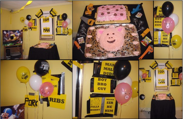 I used a piece of foam poster board on the wall and added yellow paper and used electrical tape and black duck tape to form the letters “Ham Man” and added some printed “Ham vs. Man” signs above it. There are more “manly” signs on either side with “manly” words on them. I also had white and black balloons, pink piggy balloons, and yellow balloons with dump trucks on them.