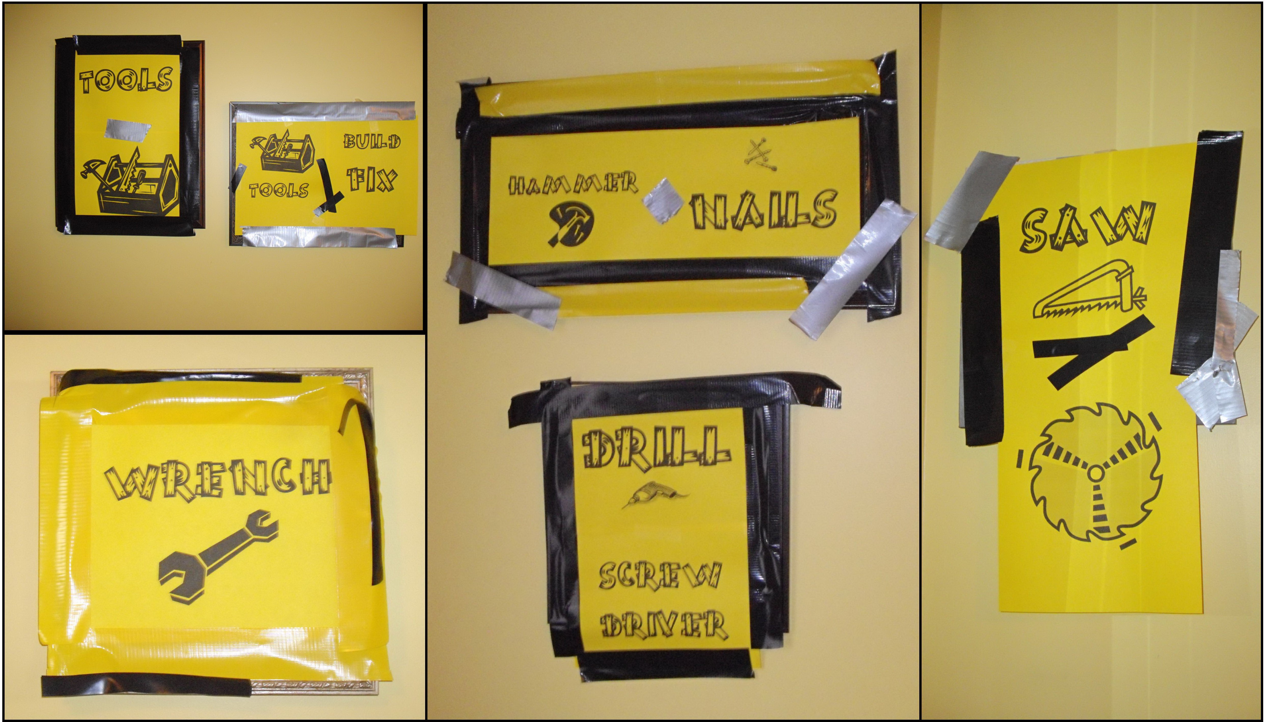 For the decorations we’ll begin with the Happy Birthday sign. I made the letters out of duck tape. This big sign is hiding my enormous bridal portrait (you can see it in one of the photos for Adaline’s party). Working hand in hand with the manly tools/construction theme I covered the mantel with “No Work Zone” tape (yellow and black matching the Steelers colors!), and hung cardboard cut-out tools and mustaches in front of the fireplace. The signs reading “manly”, “masculine”, “macho”, and “studly” were added to cover some decorative floral work above the fireplace.