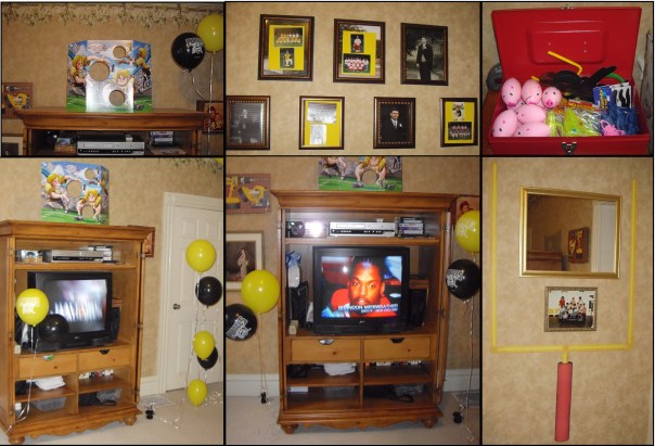 I put gold and black balloons on either side of the tv. The helium started giving out on the balloons before the party even started.