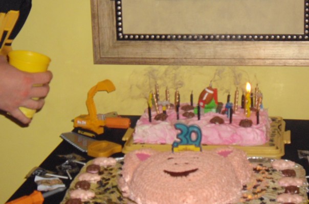 On the dessert table we have a pig cake, of course! I wanted to make a “Ham and Man” cake and put the pigs head on a man’s body, but my mom said that sounded creepy. Also, I don’t know how to do that. This is only the second cake that I’ve ever decorated, so yeah. My mom made the extra pink cake just in case there wasn’t enough pig cake to go around. Mom made piggy chocolates from a mold and put those on and around the cake. Sprinkled around the cake is “30” confetti. I placed plastic tools on the dessert table (A package of 3-4 from The Dollar Tree), lollipops that read “30 sucks”, and some gross-out candy (gummy ear wax, and vomit), because boys are gross. Needless to say nobody, even the gross boys, would even try the candy.