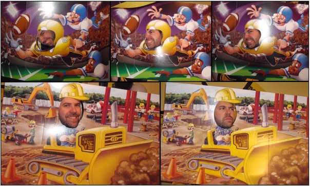 The red toolbox (one that we already had) was left opened and had “toys” in there for the fellas. The pig footballs, extra mustaches (that I used on the mantal), yellow water guns, policemen action figures, “flying” pigs, and a goal post headband that you put on and throw a Velcro football at. The guys actually used the Velcro game some, played the football toss game (it almost always fell over), and had fun hurting one another with the flying pigs. It’s just not fun unless it’s dangerous.