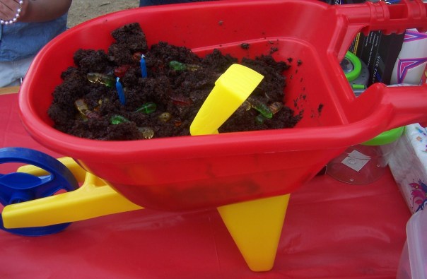 for the girl cake put a shovel full of cake in the pot and insert the flower, stick it on top of the cake and lay the gardening gloves over the edge.