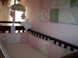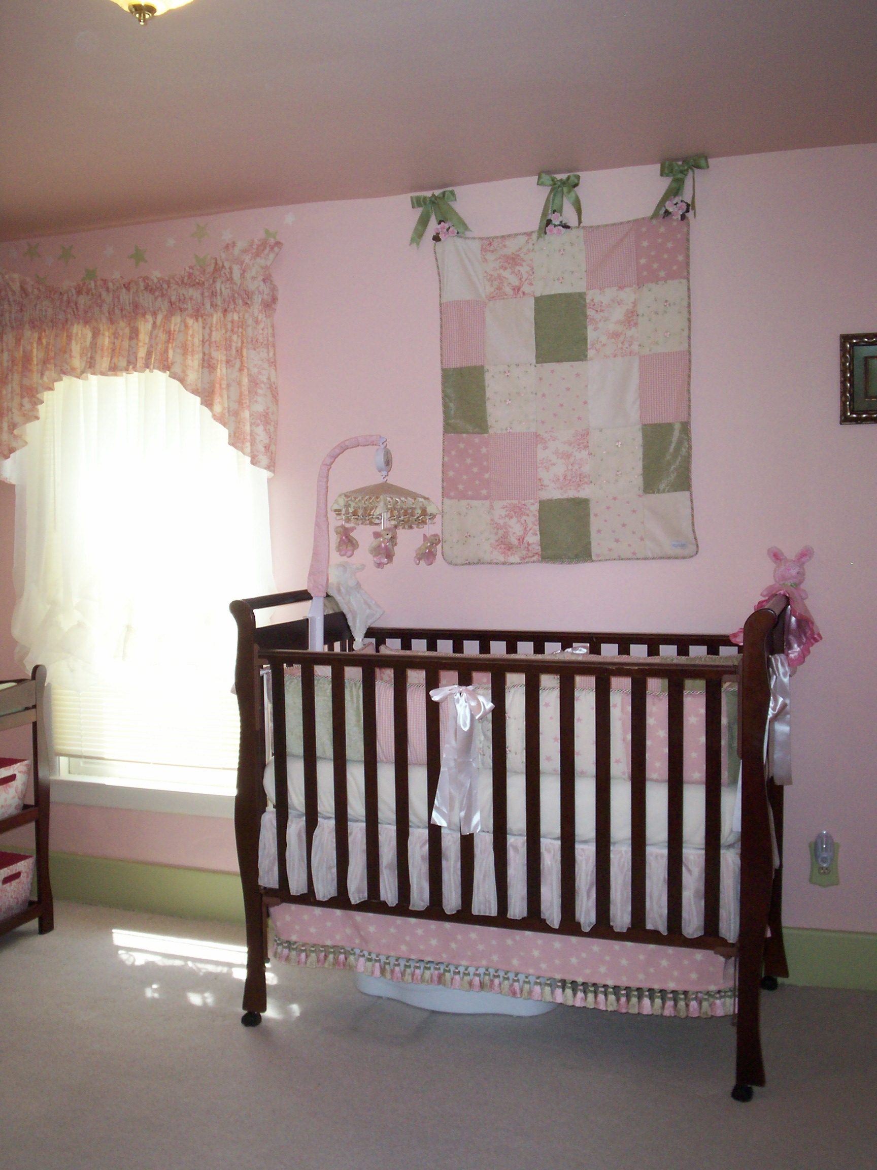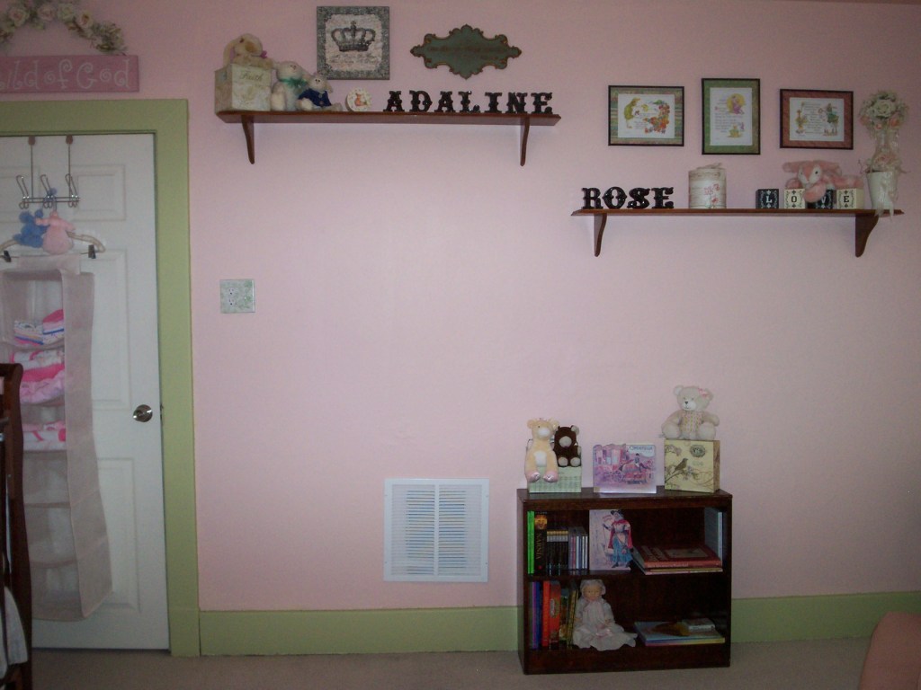 I thought I’d share some pictures of Adaline’s nursery. These pictures were taken a few weeks before she was born. In the past year we’ve made some changes, the biggest of all being that you can’t keep a room quite that tidy with a 12 month old walking around in it. For the nursery I wanted something pretty and girly without it being too babyish. I wanted her to be able to grow into it and be able to change it easily if we needed to. I didn’t want to get a bunch of “nursery” items that would no longer be appropriate for a “big girl” in a few years. We ended up with what I think is a sort of shabby chic look in pink and green. I just hope she likes pink when she gets older 😉