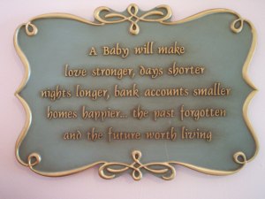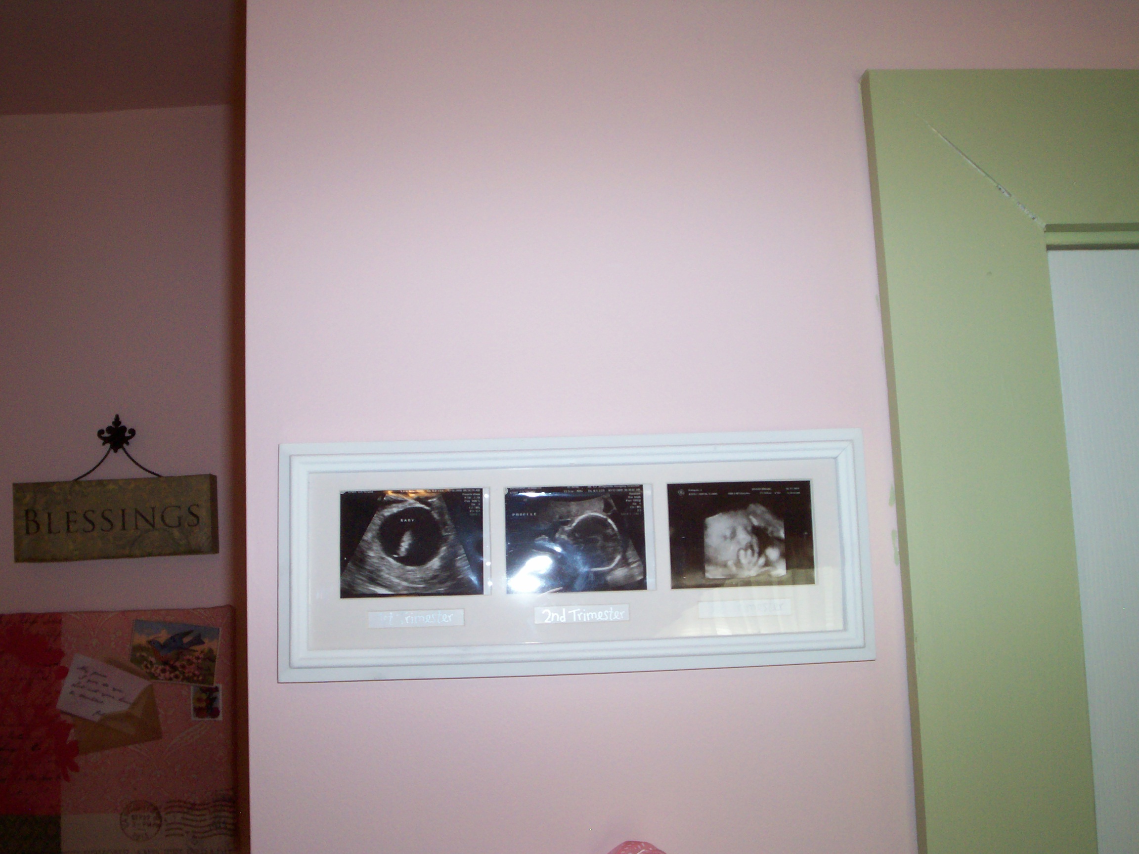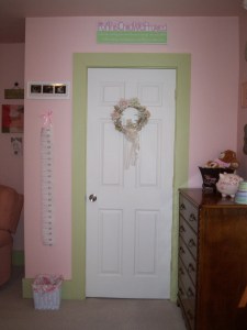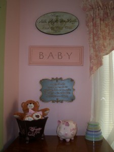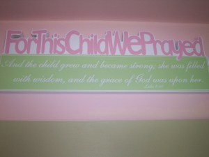 The Philippians 4:8 sign is from The Hobby Lobby. The pink baby sign and baby quote beneath it are from Kirkland’s. The wreath on the door was another centerpiece from our wedding (used as a candle ring for hurricane lamps). The “For this child we prayed…” plaque is from Family Christian Stores. The white photo frame from Babies R Us contains an ultrasound from each trimester. I saw the growth chart at The Hobby Lobby and bought it before I was even pregnant. The basket is from Michael’s.