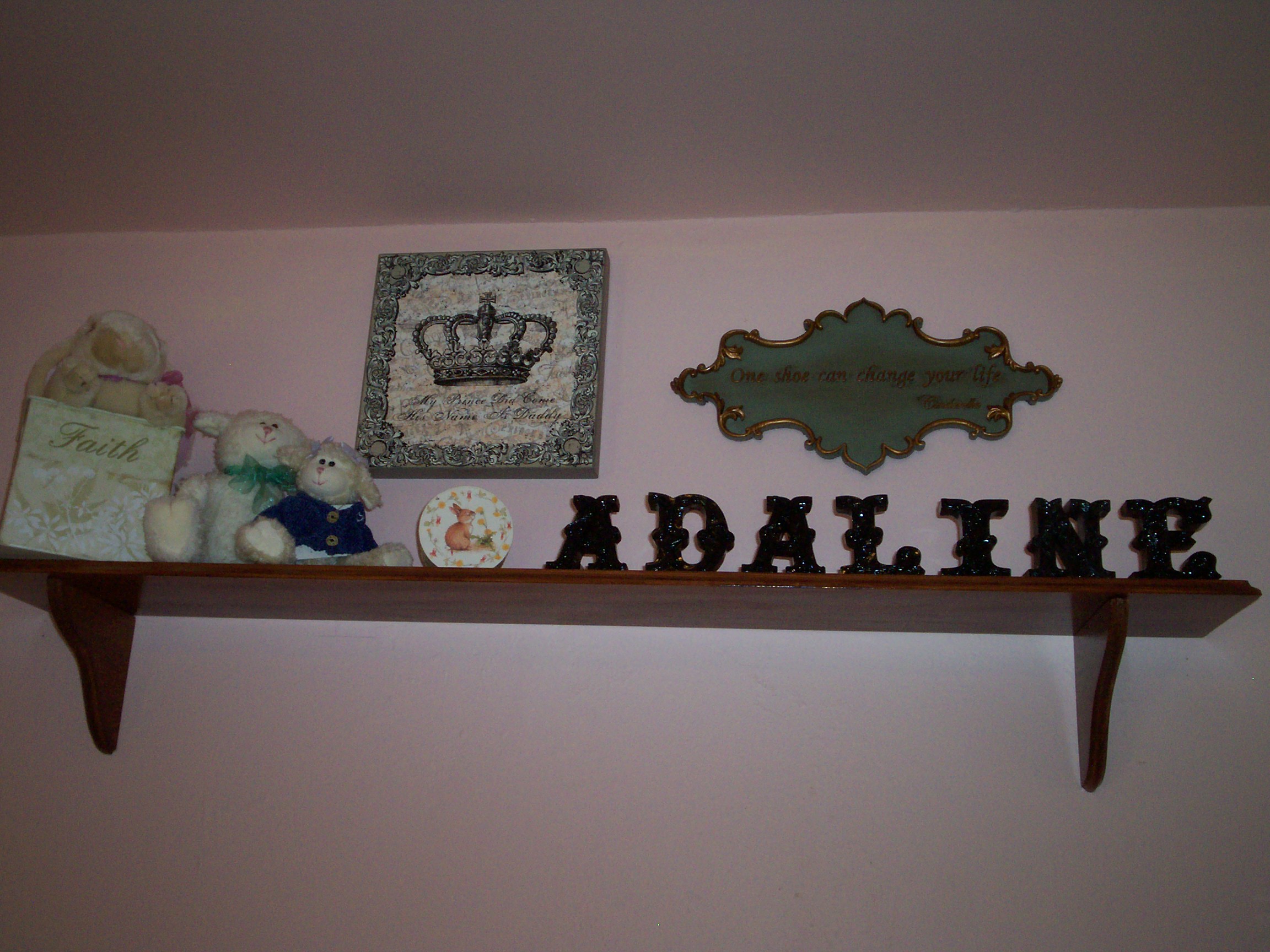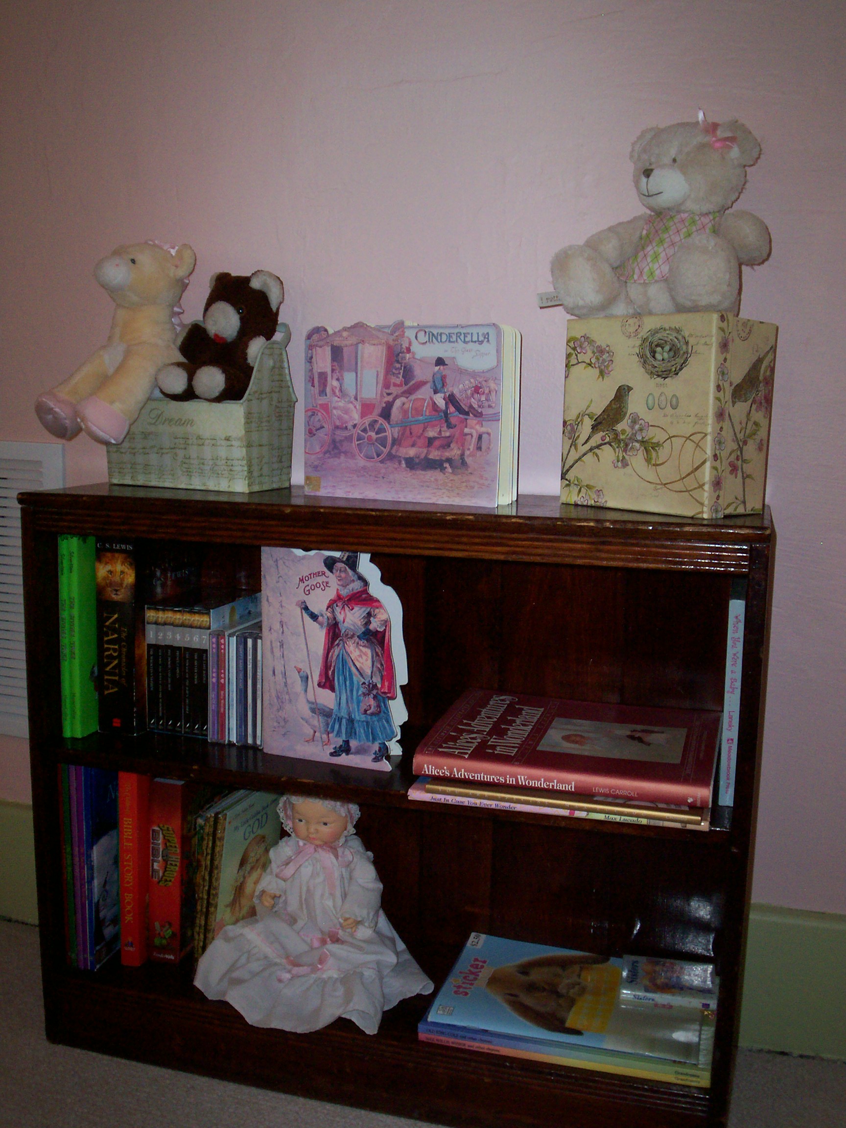 The giraffe was a gift from my mother. The brown bear was my very first teddy bear. The Cinderella book (and Mother Goose book on the shelf beneath it) was from a local hobby/antique shop. The box was from Michael’s and the bear is Adaline’s first bear. Cool Daddy got it for her at Babies R Us. Most of the books and Bibles on the shelves we already had. The baby doll was part of my doll collection as a child.