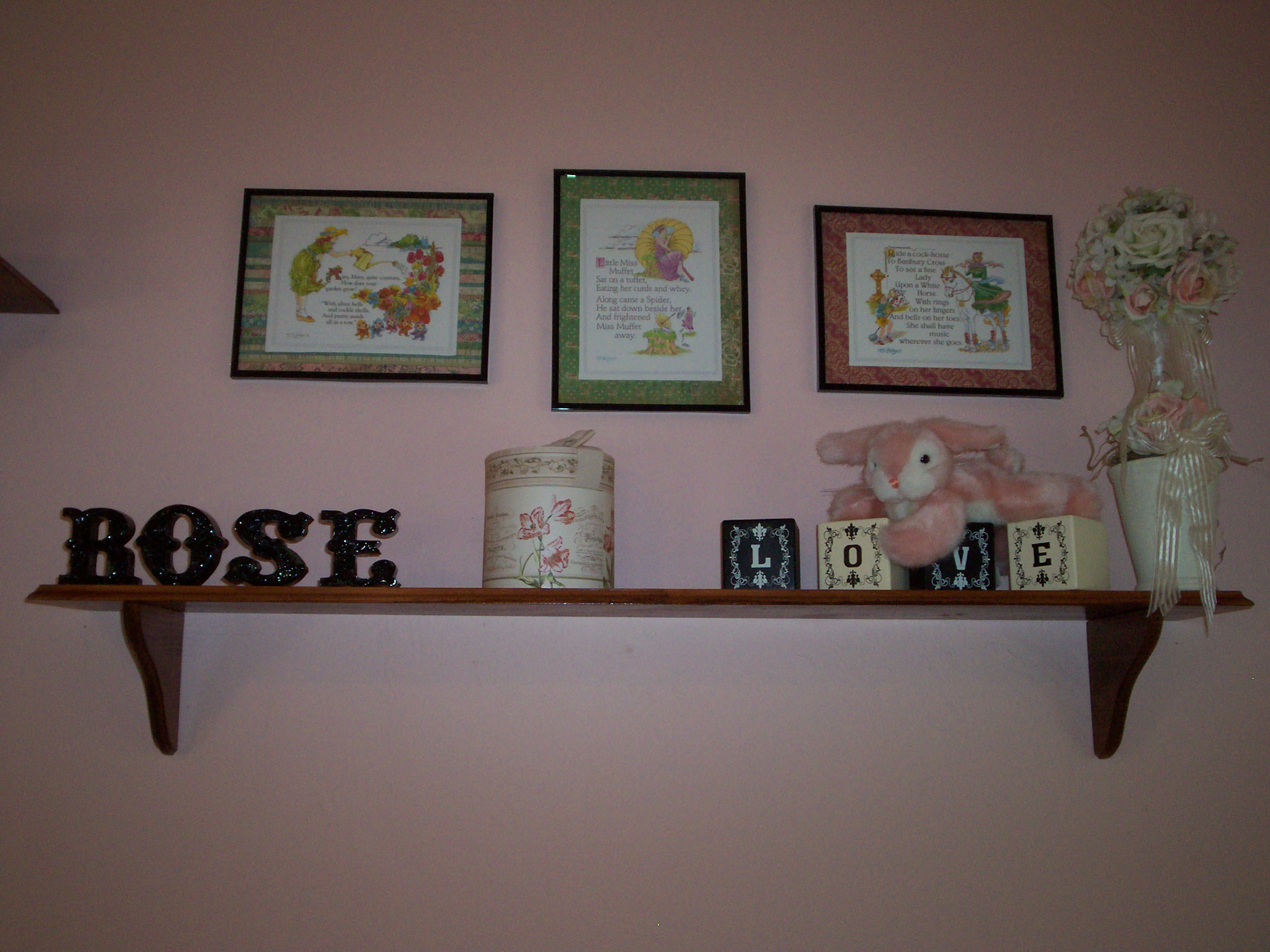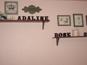 You may remember these black ceramic letters that spell Adaline from the mantel display at her first birthday party. On the other shelf they spell out her middle name, Rose. I found these letters at the Hobby Lobby. The “Faith” box and wall décor were from Michael’s, The Hobby Lobby, and Kirkland’s respectively. The bunny and lambs had been mine for years. I got the cute little round bunny box at a local hobby/antique store. The round box was from Michael’s, the “Love” blocks from The Hobby Lobby, another of my own bunnies, and another topiary centerpiece from our wedding. The nursery rhyme prints I found at Wal-Mart for $1.00 years ago when we first got married. We used scrapbook paper to matte them and I believe those frames were from something else that we no longer had on display.