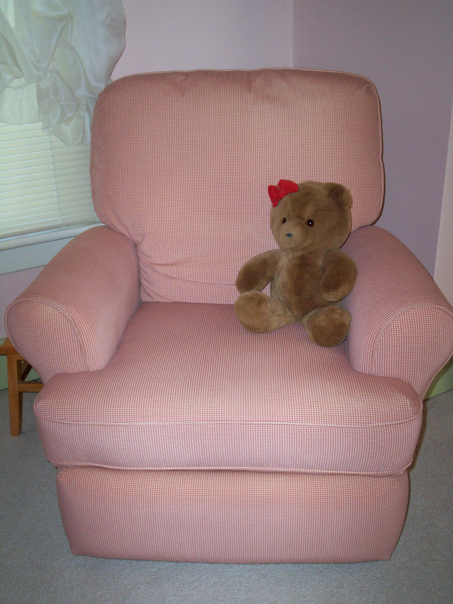 The glider/recliner from USA Baby was a gift from my mom, sister, and brother-in-law. Getting the fabric was a whole ordeal and a blog for another time. Just know that I wanted it to be green and fabric that I ordered was discontinued…twice. The adorable bear on the glider, Honey Jo, has been my pal for over 20 years.
