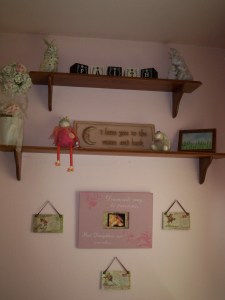 Everything from The Hobby Lobby, Kirkland’s, and Michael’s was 50% off or on some kind of sale or clearance. Many of the items were reused or repurposed items that we already had. Many things were gifts. Very few items were purchased brand new at full price. Some things that aren’t “babyish” and that aren’t particularly pink or girly can be used as she grows older or used elsewhere in the house if her color scheme changes. I’m sure hoping that she’d like to keep it like this for awhile. I hope you enjoyed it!