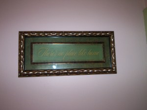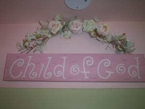The “Child of God” sign is from The Hobby Lobby. The swag above it is actually another of the flower ring centerpieces from our wedding unbent.