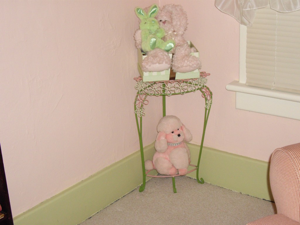 The cute wire table is from The Hobby Lobby. The stuffed bunnies were mine (Cool Daddy has gotten me one for Easter every year since we first started dating). The box they are sitting in is the box that her teddy bear came in. The pink poodle, FiFi, has been mine for about 20 years.