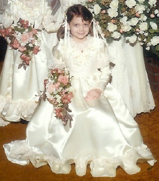 I wore my beautiful flower girl dress from my aunt’s wedding. A picture of me in the dress at the wedding can be seen below. We bought a scepter at the store. It was almost as tall as me. It was plastic with a red handle and a white star at the top. You could put batteries in it and the star would light up. I hated the red handle so my mom wrapped ribbon all around it and put glitter on the star so that it would shine when it was turned on. I don’t remember anything else about the costume, like what I did with my hair or wore on my head. I think I might’ve been a fairy princess…which means I would’ve had wings. For whatever reason, the scepter is what I remember the most.