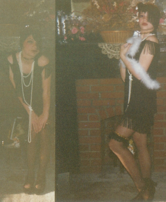 This year I wore a flapper costume to the Halloween Parade. The below photo is actually from a talent show about 5 months before Halloween, but it’s the same thing that I wore except for the shoes. I wore black jazz shoes instead. The costume began as a long black dress with spaghetti straps that I had been given as a hand-me-down. The material was that stretchy, wrinkled kind and the dress was way too long for me (I tripped in it). We cut the bottom of the dress off and then my mom took rows of black fringe and sewed them around the dress and added some to the shoulders. She took some of the cut off material from the skirt and tied it into a headband/bow and then attached more fringe. The gold sequin cap, choker, and garter were all part of an old ballet costume from years before. We attached fringe to the garter and removed the giant blue feathers from the cap. My mom already had the pearls. I added a boa and black hosiery (which had seams up the back, but you can’t tell in the photos). Finish off the look with dramatic make up and spit curls (not visible in the photo).