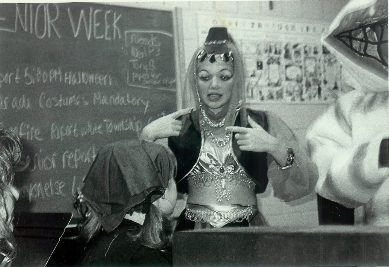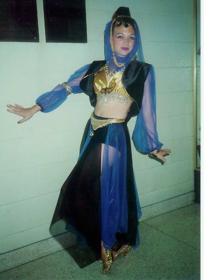 In 1996 I was a senior in high school and this would be my last Halloween parade. We bought the genie costume at the store, but embellished it with my mom’s jewelry. Everything hanging off of the hat, the top, and the waist are my mom’s jewelry with added bracelets and arm cuff. You can’t really tell in the picture but I also have a tiny genie lamp hanging from my waist. We took plain white shoes and added gold glitter and sequin. You can’t see it in the photo, but we also painted a genie onto my calf. During the parade some kid came running up to me and handed me an envelope (which I thought was weird). Later on when I got to open it I found out I had one a $5 prize for a good costume. I never bothered to redeem it.